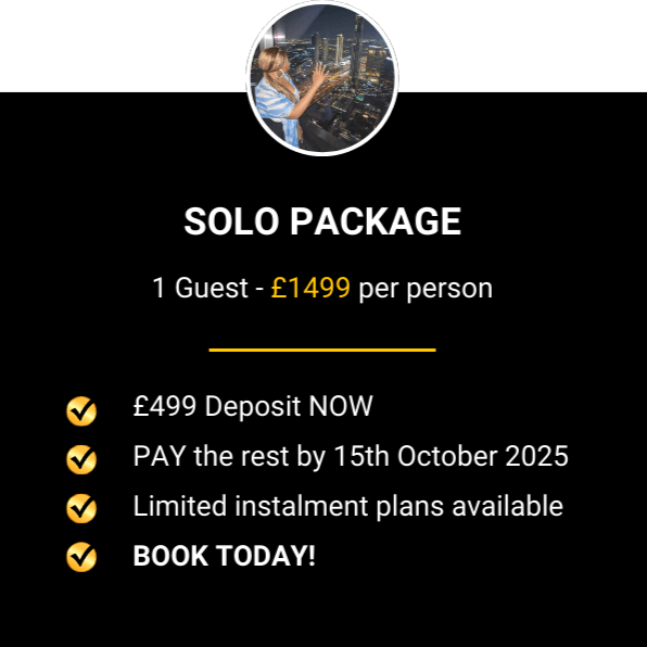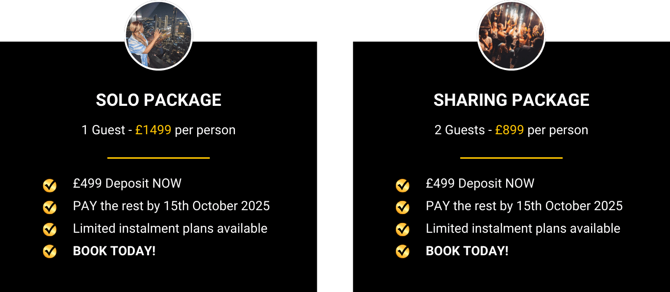 Secure your spot with just £499 deposit, then pay the remainder in small instalments → includes VIP networking events, hotel accommodation, excursions, parties and more!